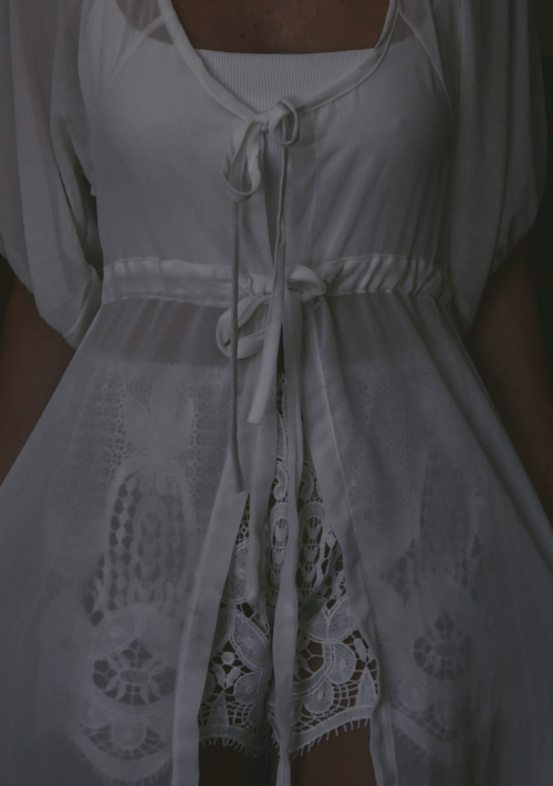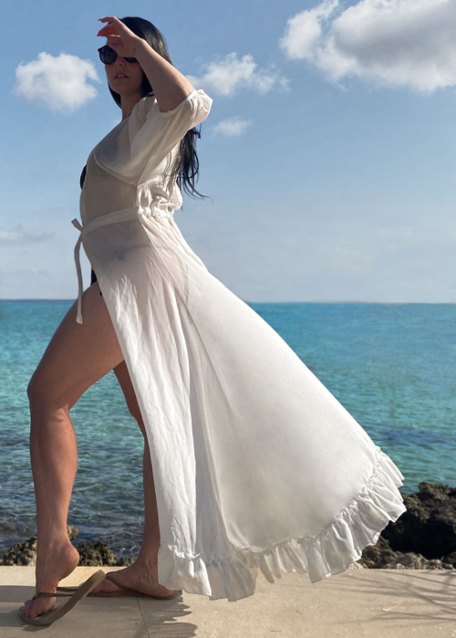 Wear as a beach cover on top of your bikini or swimsuit or wear together with denim. This romantic attire has draw strings at chest and waist, wear it fully open or tie it to enhance the silhouette. Dress up for beach mingle and sunset drinks.
