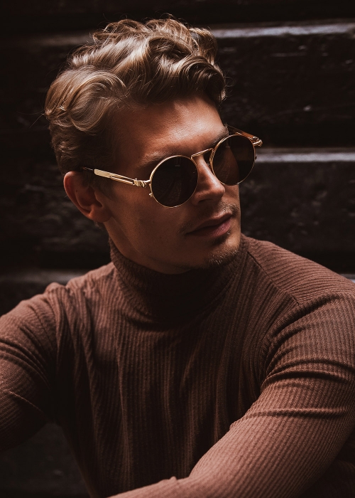 Timeless round design with gold colour metal temple. Inspired by Mad Max and the Steampunk. Choose between 3 colour options for the lens. Blue, Brown and Black – Comes in two sizes; 50mm and 55mm. The ultimate gift for him and her.