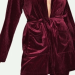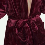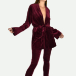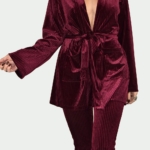 Kimono jacket & slim pants: Comfortable, loose fit kimono jacket and slim pants. Striped super soft wine red velvet fabric. An attachable waistband to enhance the female silhouette. A timeless piece of art.