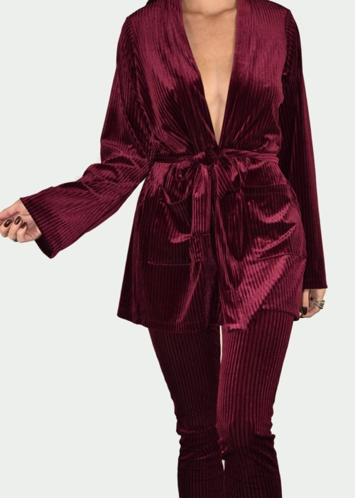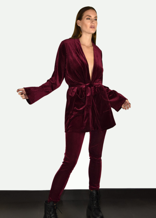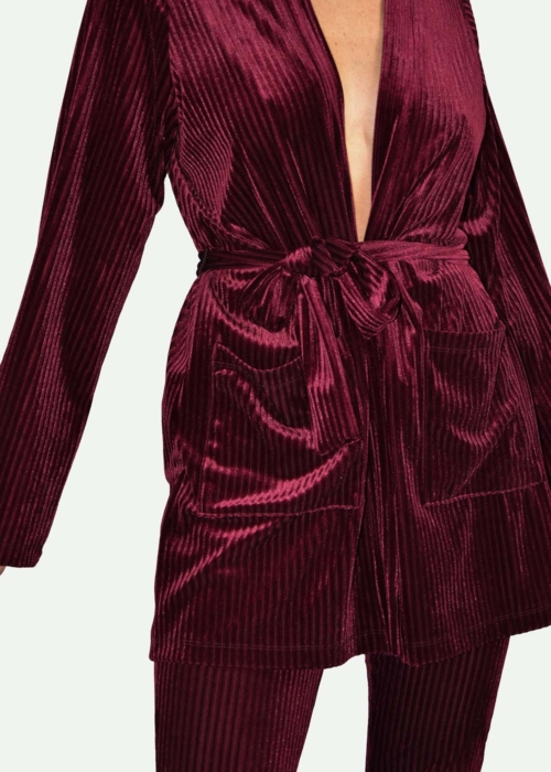 Kimono jacket & slim pants: Comfortable, loose fit kimono jacket and slim pants. Striped super soft wine red velvet fabric. An attachable waistband to enhance the female silhouette. A timeless piece of art.