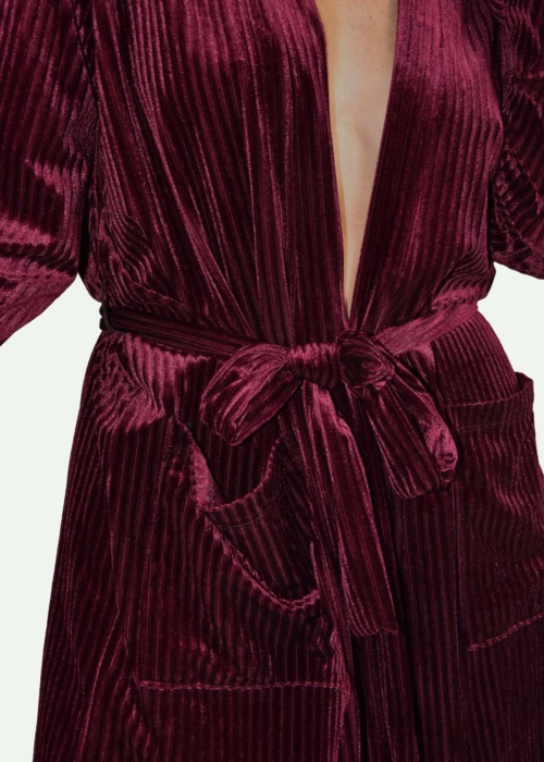 Our velvet sets are very popular so we have made a new design for you. This time in a energetic wine red colour. A striped kimono jacket and matching slim stretch pants with a silky soft inside. Made to wear in winter, spring and autumn. A perfect blend of bold and daring.
