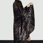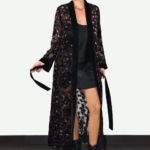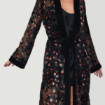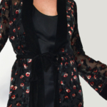 Our popular Samurai Kimono in a new artistic eye-catching fabric. Crafted in burnt out velvet. Inspired by the romantic nights of Paris. Red, peach and green velvet covering the black mesh base. From the dinner to the party, this magnetic piece is ready to make an impact.