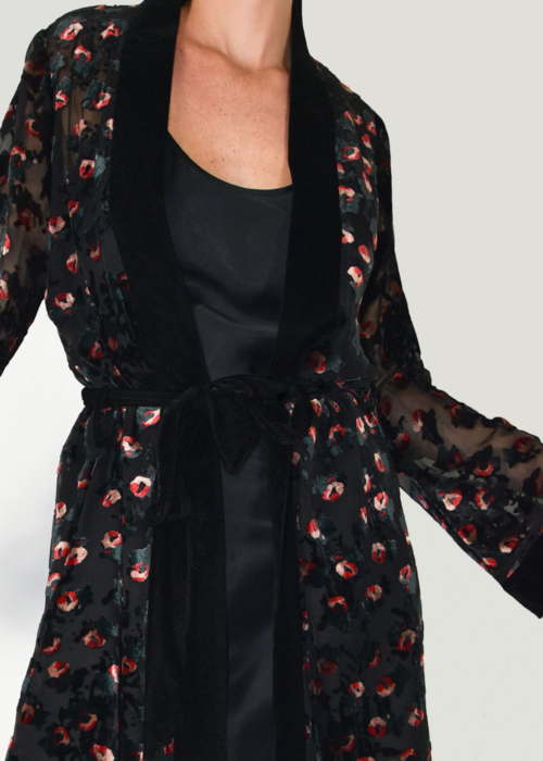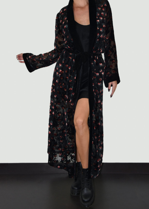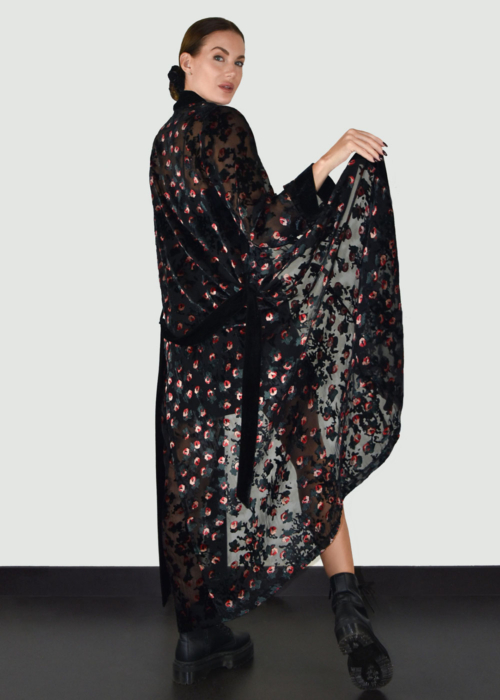 Our popular Samurai Kimono in a new artistic eye-catching fabric. Crafted in burnt out velvet. Inspired by the romantic nights of Paris. Red, peach and green velvet covering the black mesh base. From the dinner to the party, this magnetic piece is ready to make an impact.