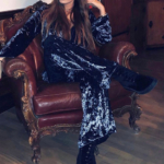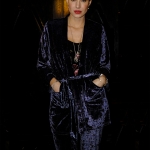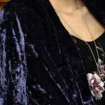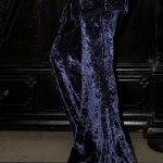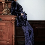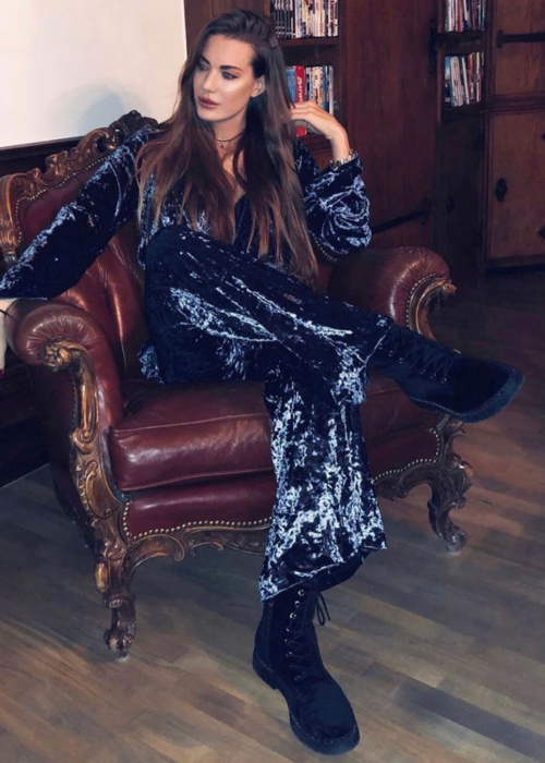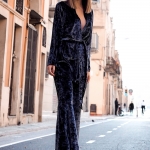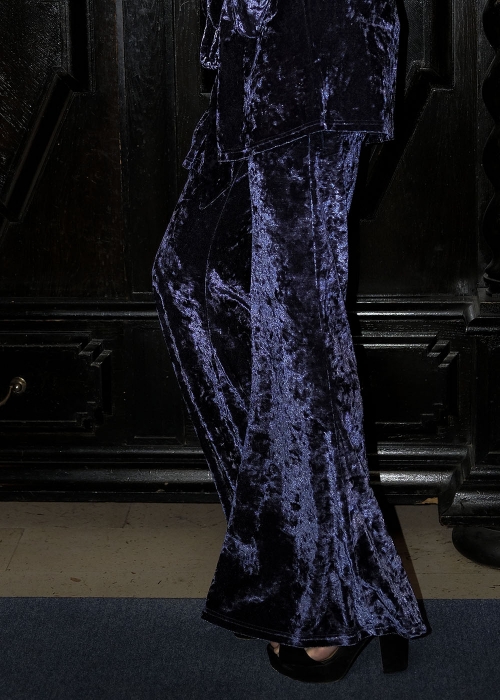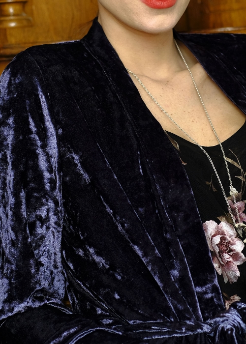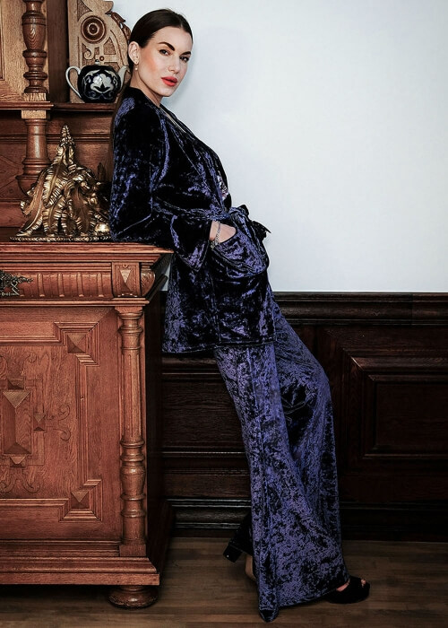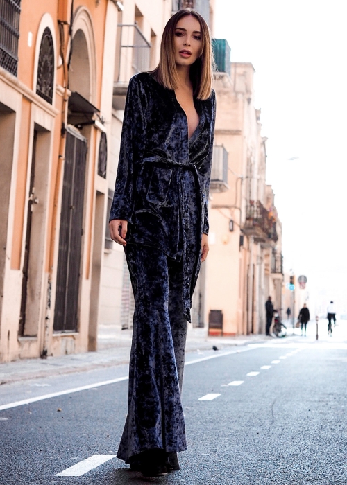 Get ready for the weekend! This beautiful set is made of soft blue velvet. It includes a short kimono jacket with pockets at front, a waistband, and matching pants. The waist of the pants can be worn both high or low.